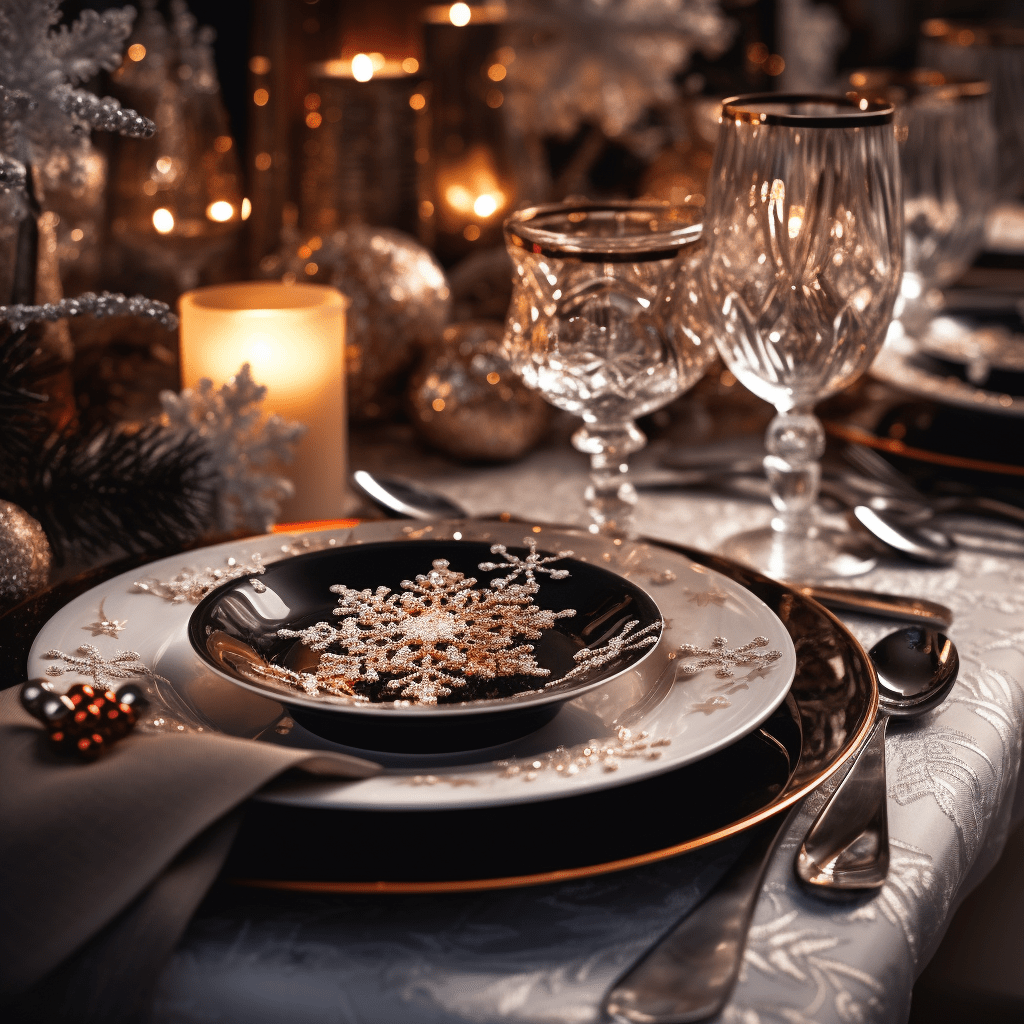 Moderní eleganci černého s jemným třpytem zlatých a stříbrných ozdob. Kontrastní kombinace černých prvků s lesklými zlatými a stříbrnými baňkami vytváří sofistikovaný a atraktivní prostor pro váš stůl, který se dokonale hodí pro moderní sváteční atmosféru.